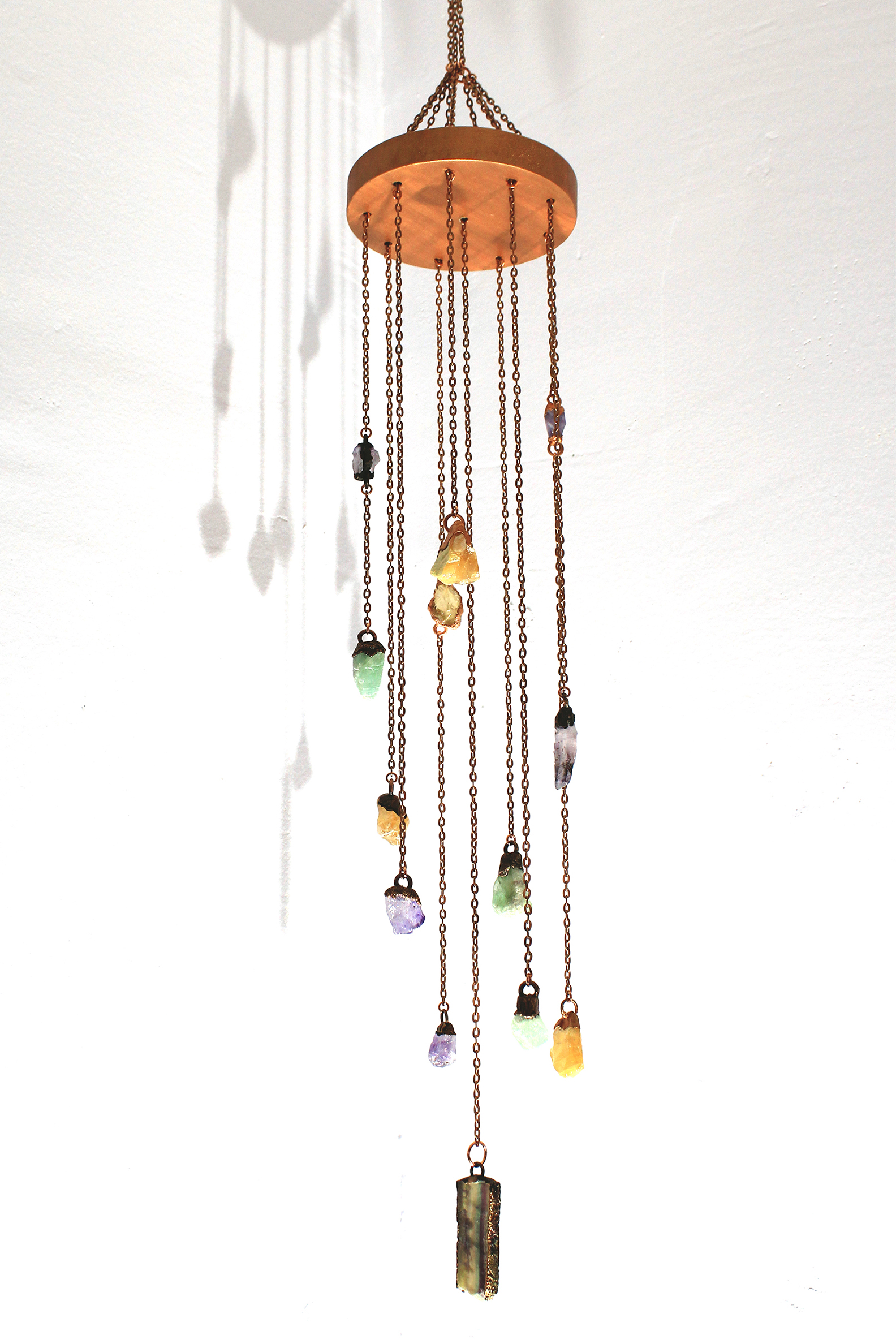 Ten copper tone metal chains suspended from a copper tone painted wood disc.