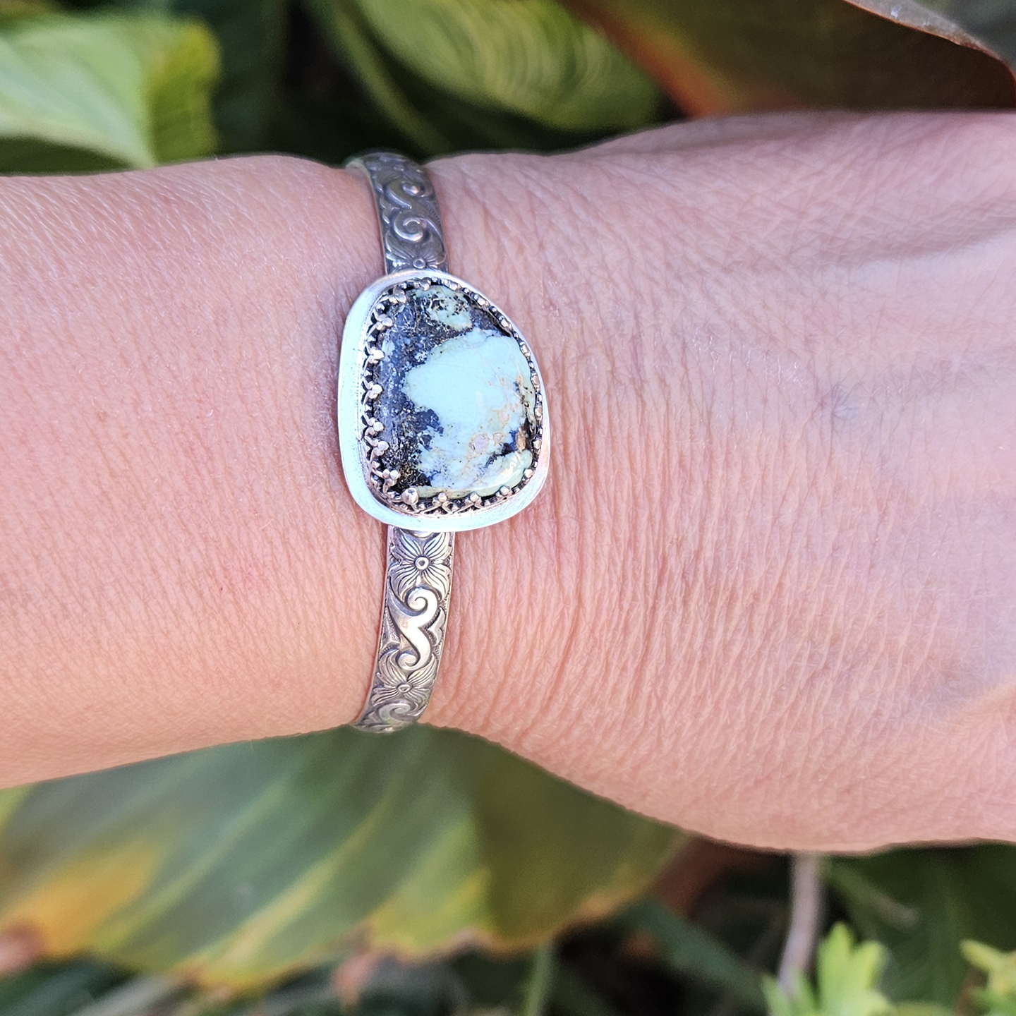 The sturdy yet elegant band is crafted from 6mm wide half-round sterling silver embossed wire, showcasing an intricate texture that adds depth and visual interest. Designed for ultimate versatility, this artisan sterling silver cuff can be worn as a striking solo statement piece or seamlessly stacked with your other favorite boho bracelets and gemstone jewelry.