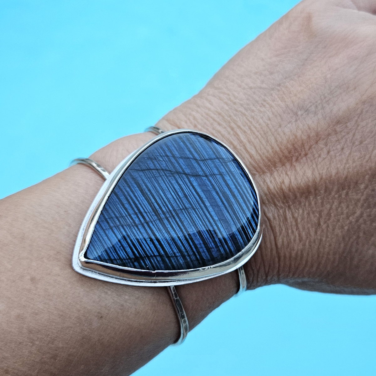This one-of-a-kind cuff bracelet is built around an exceptional Labradorite stone, showcasing a rare and intense electric blue flash that seems to glow from the stone’s depths. Labradorite’s base color is a dark, stormy gray, but when it catches the light, the colorful, mesmerizing phenomenon known as labradorescence appears—a true moment of pure magic.
