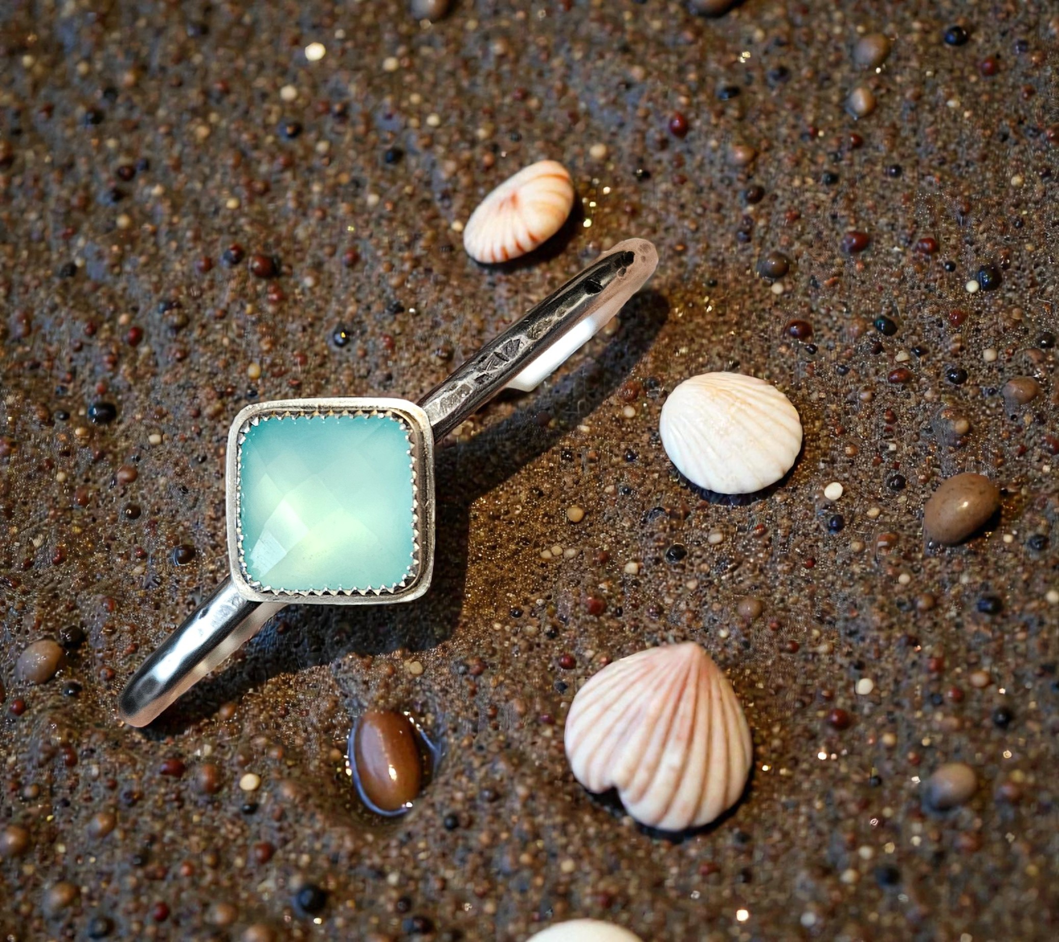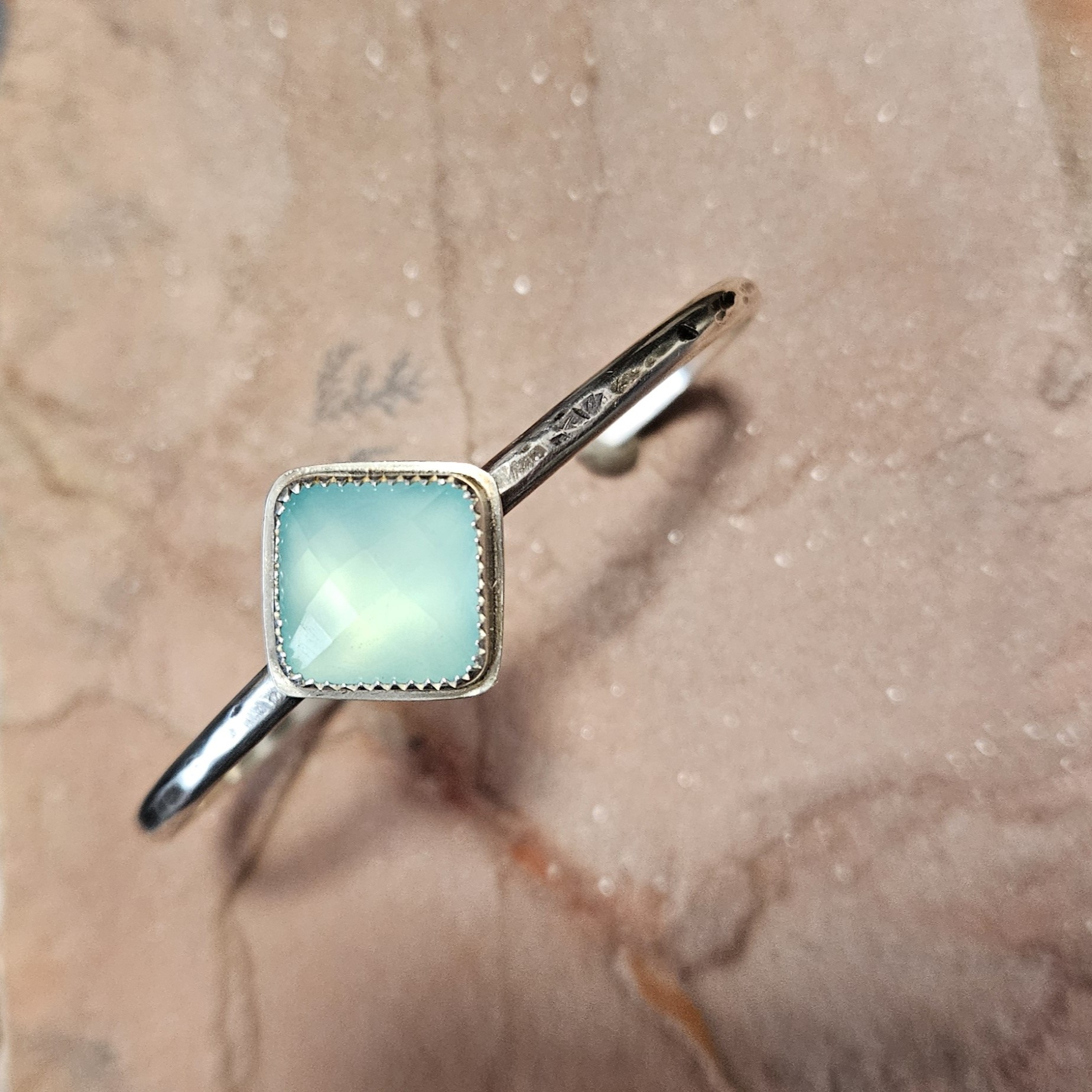 This cuff features a brilliant, square-cut and faceted Aqua Chalcedony cabochon gemstone 12mm x 12mm. This stone is an absolute stunner, possessing an ethereal quality that causes it to glow beautifully when touched by light—reminiscent of a wave cresting with sunlight illuminating the foam. Aqua Chalcedony is revered for its ability to enhance communication, creativity, and promote a feeling of lightheartedness and calm.