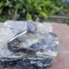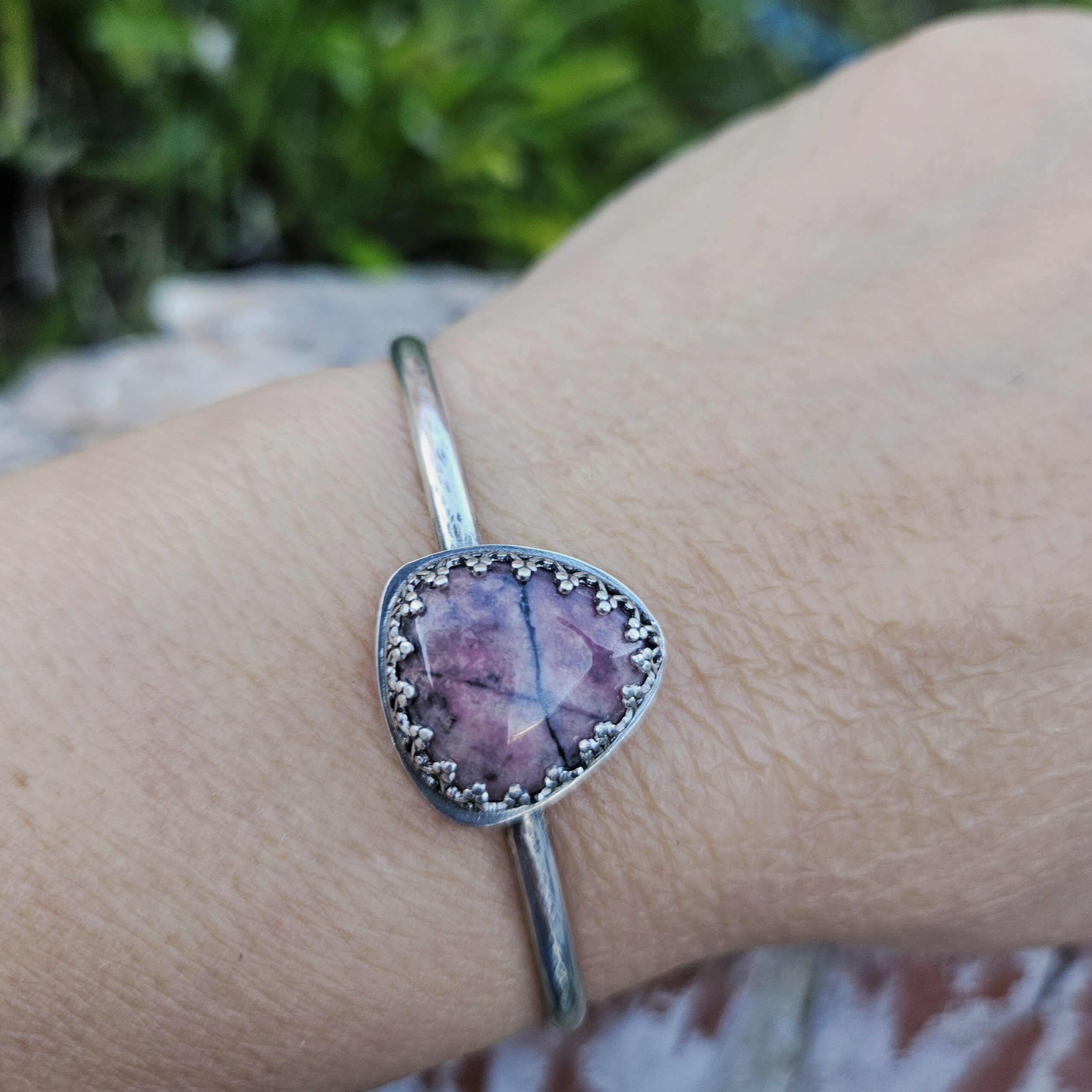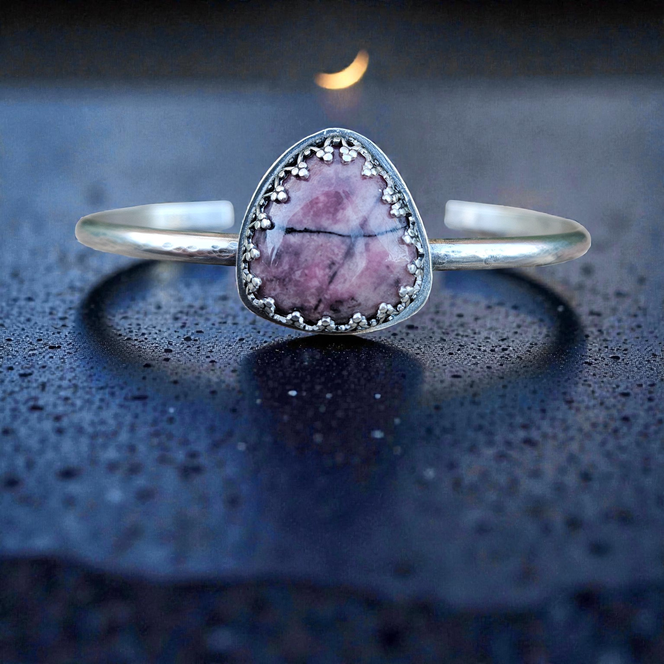 The Rhodonite is held securely in a high-shine fine silver bezel that sits atop a sturdy sterling silver cuff. The setting’s unique shape is reminiscent of a heart-shaped crown, adding a touch of regal bohemian style. The cuff band itself is crafted from a comfortable, lightweight yet durable 8-gauge half-round sterling wire (3mm profile width). It features a subtle, lightly hammered texture that catches the light beautifully.