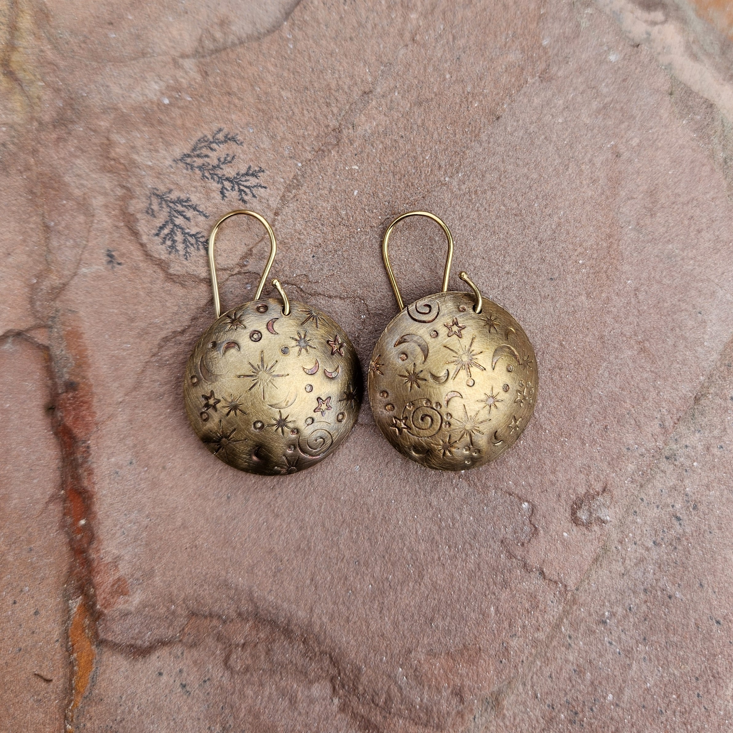 A fragment of the night sky, forged in metal. These earrings are crafted from high-grade jewelers red brass, a luminous alloy historically known as “Merlin’s Gold.” The name reflects the metal’s warm, golden glow and its enduring, mystical nature.
