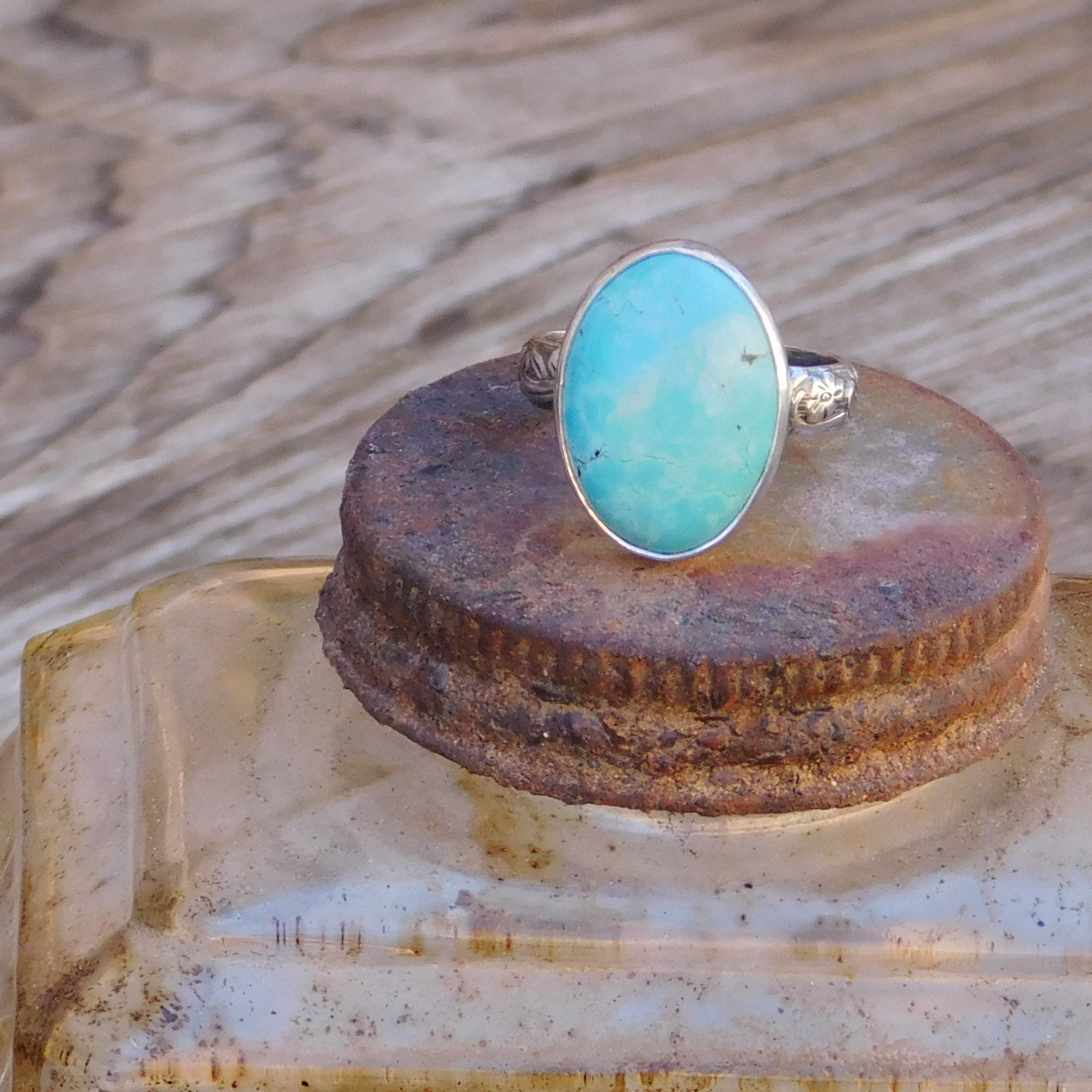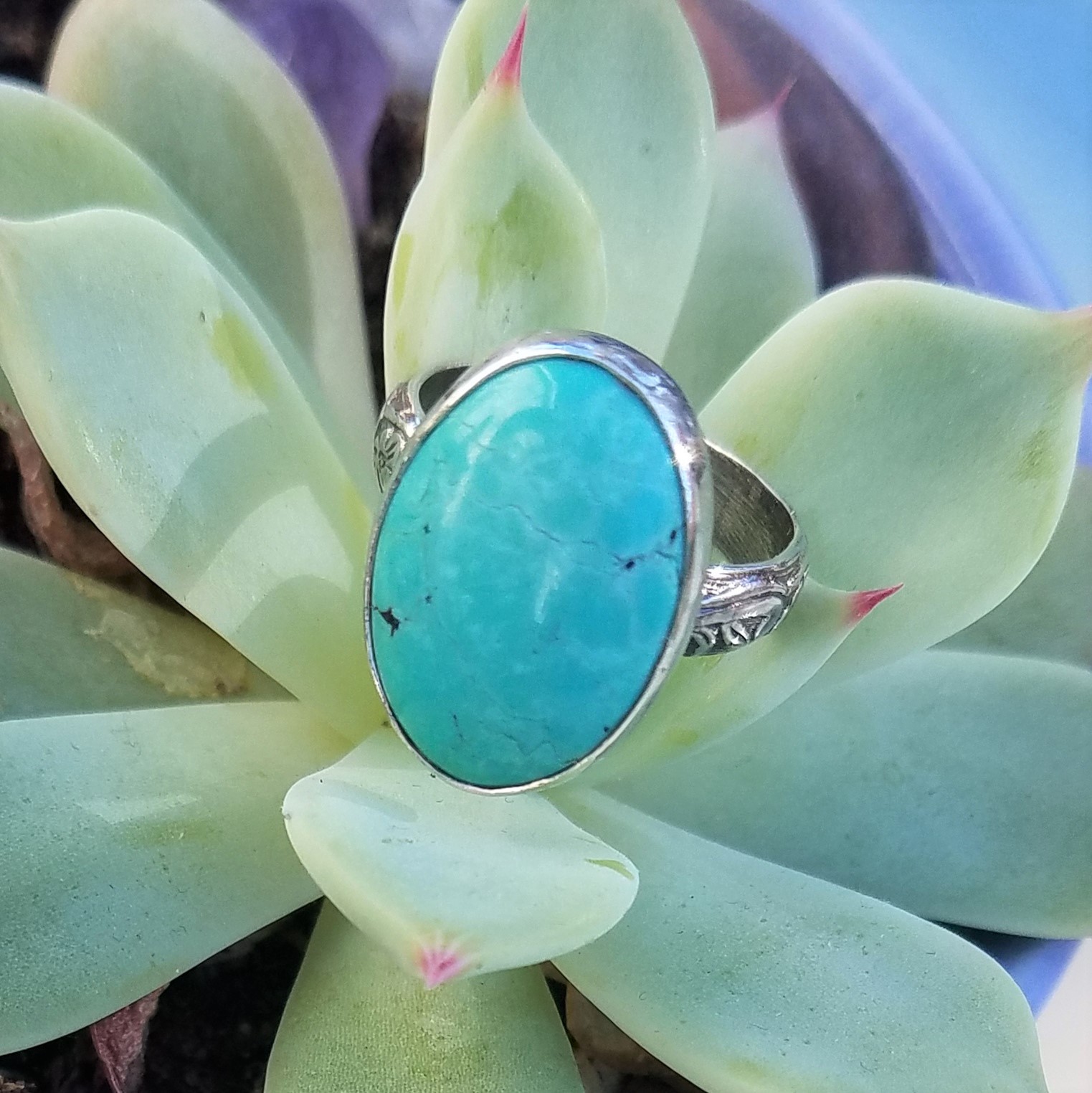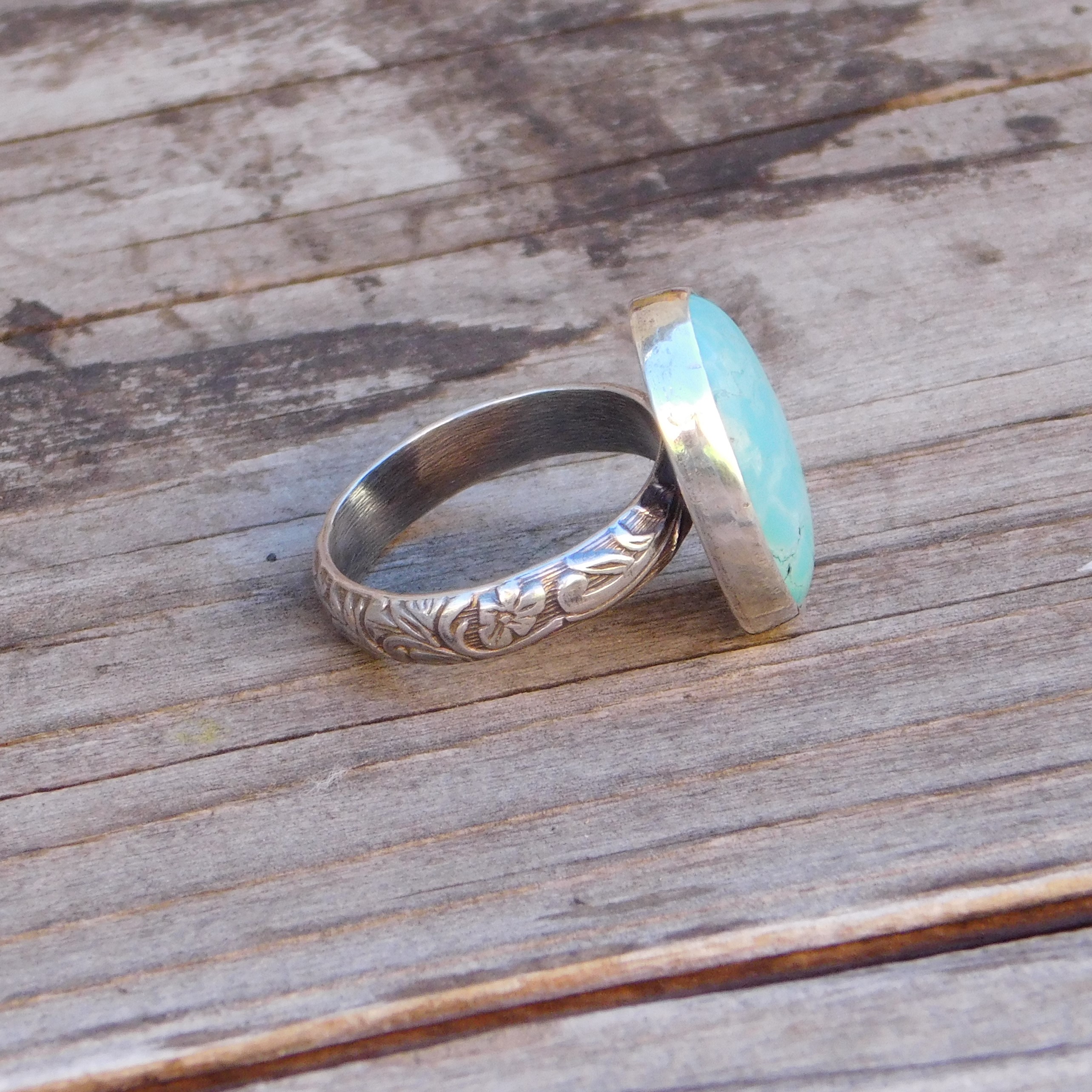Gorgeous sky blue stone set in sterling silver with a floral motif band.