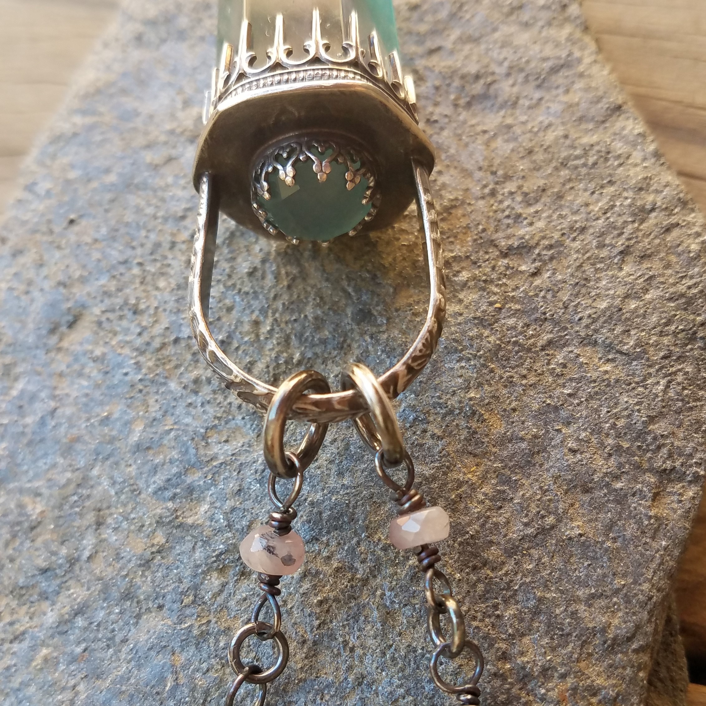This beautiful fluorite point is crowned with a sea green rose cut chalcedony.