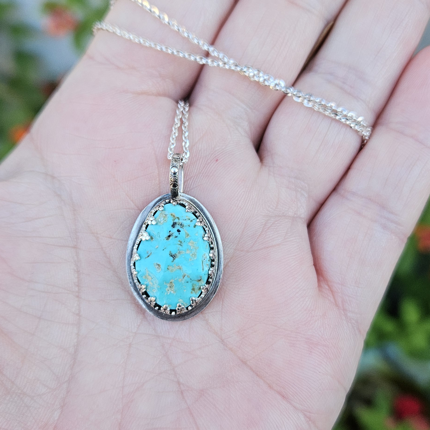 Discover a truly one-of-a-kind treasure with our American mined Kingman Turquoise Nugget Pendant Necklace. This exquisite piece of handmade jewelry features a stunning, natural Kingman Turquoise nugget, measuring approximately 14mm x 19mm, renowned for its vibrant blue-green hues and unique matrix patterns. Each turquoise stone is a unique work of art, ensuring your pendant is truly distinct.