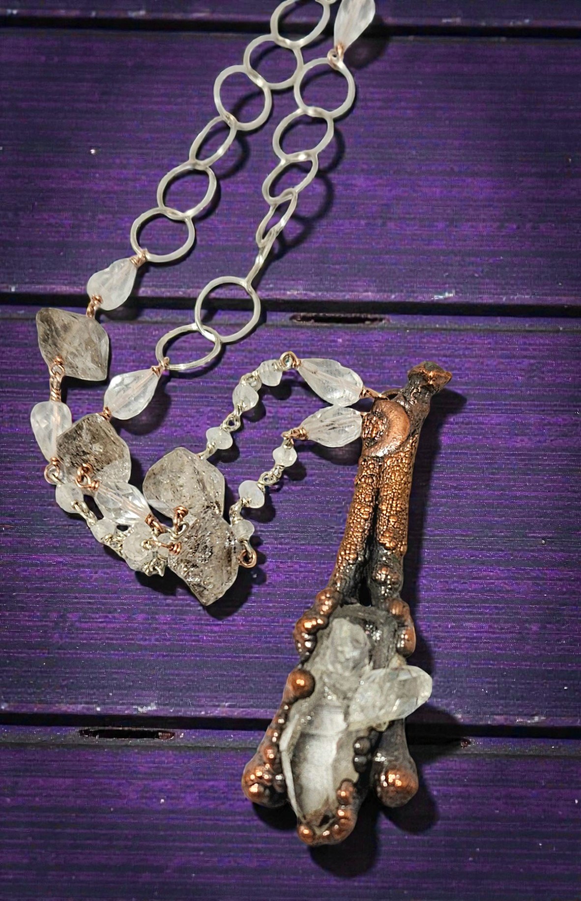 The Rosary Chain: This is not a standard chain; it is a labor of love. Twenty inches of sterling silver and copper wire, meticulously hand-beaded with Herkimer diamonds, clear quartz, and rock quartz.