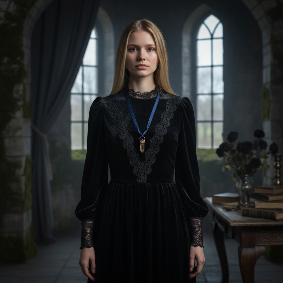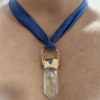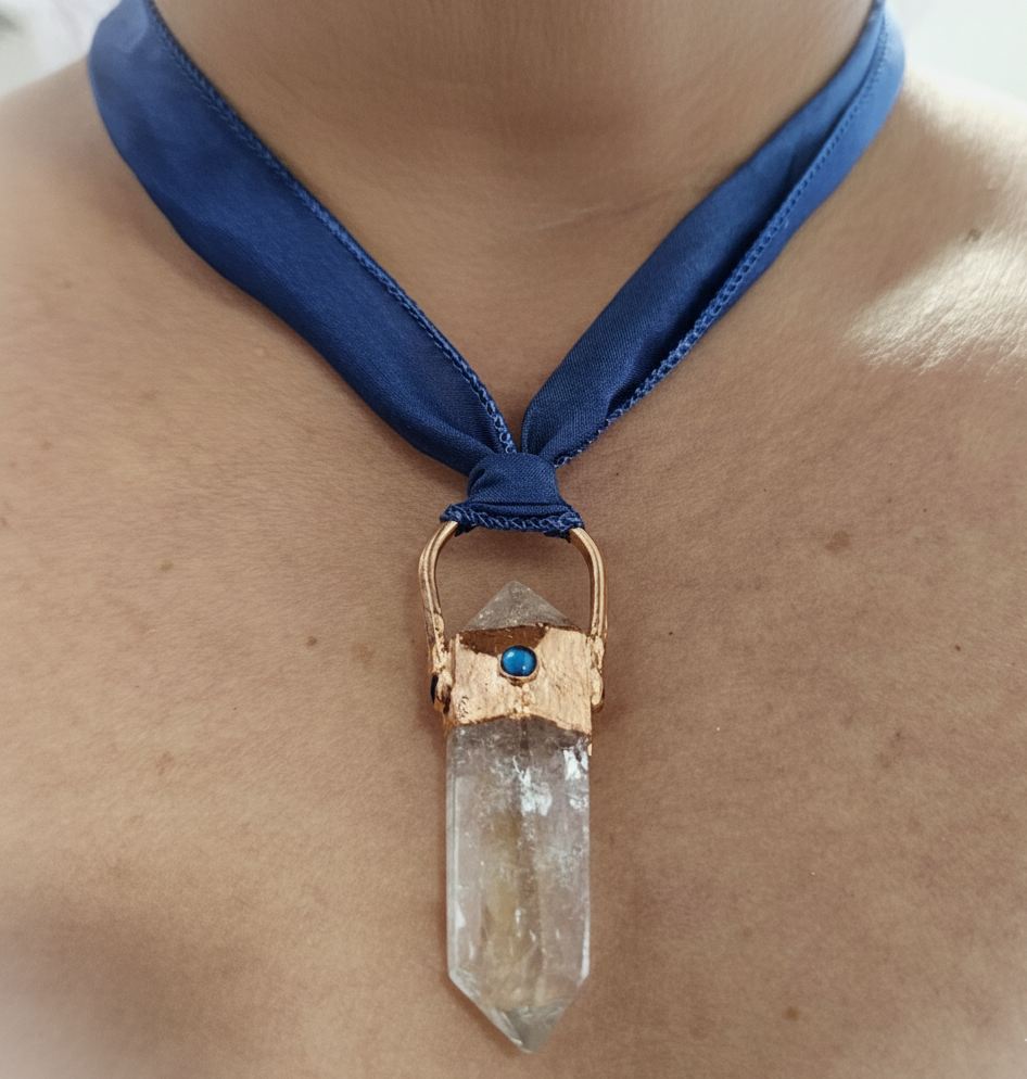 The Ritual Intention Hold the Cerulean Seer during your evening reflections. As the light hits the rainbow inclusions within the quartz, let it remind you of the hidden magic within your own journey. The adjustable silk ribbon allows it to sit close to your heart or rest lower as a protective shield.