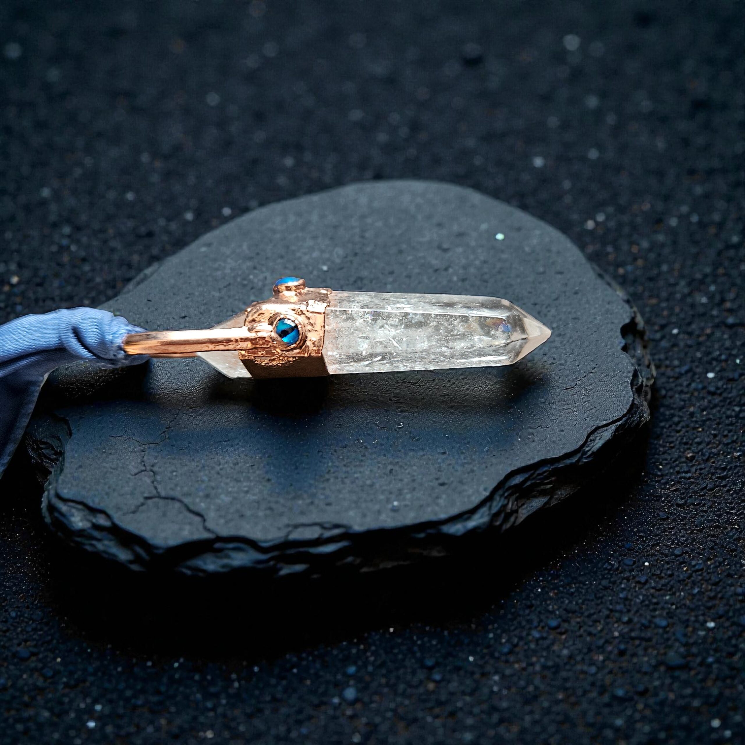 A portal to the deep and the divine. This one-of-a-kind talisman features a powerful, double-terminated Clear Quartz point, hand-encased in a textured landscape of copper. Adorned with three vibrant blue Abalone accents, one centered on the front and one on each side, this piece is designed to catch the light from every angle, mirroring the shimmer of a hidden forest pool.