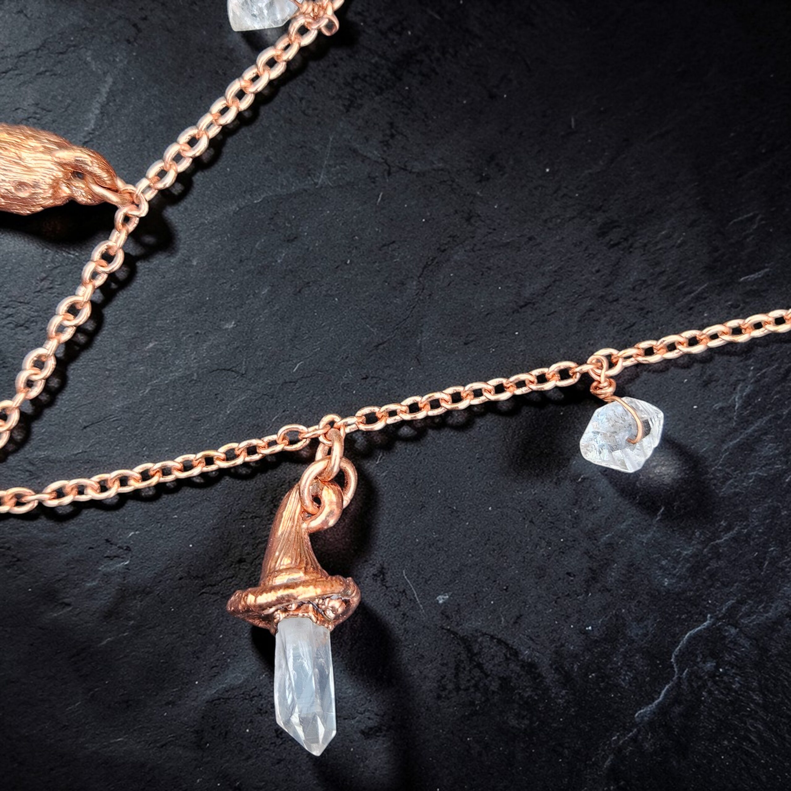The Guardians: Flanked by a”Witch’s Peak” crystal hat and a clear quartz, sculpted and preserved in pure, textured copper.