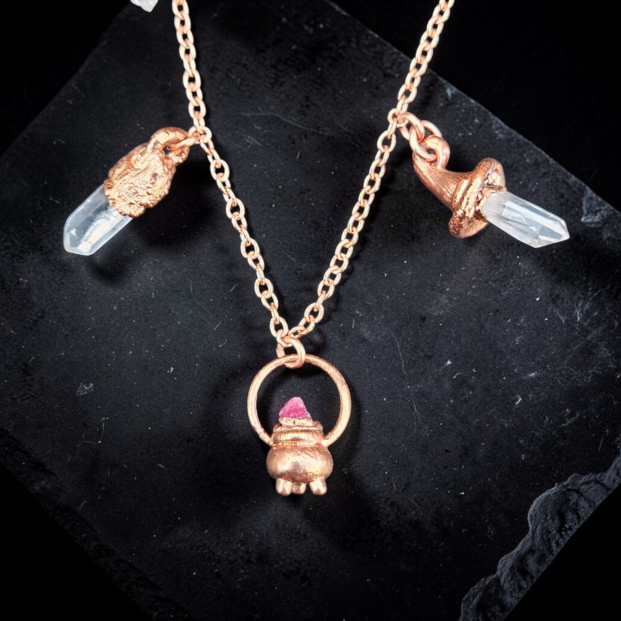 The Vessel: A hand-forged copper cauldron “bubbling” with a fragment of Raw Pink Spinel.