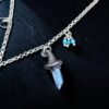 The Stone: A high-vibrancy Aqua Aura Quartz point, radiating iridescent blues and teals.