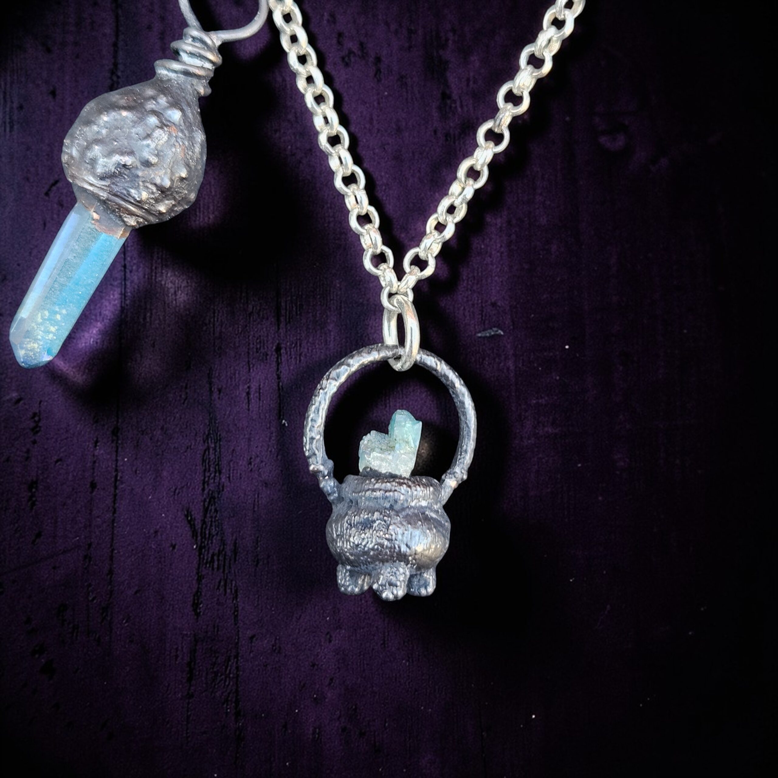 Born from the quiet hours of the night and the foraged treasures of the forest floor, the Midnight Coven necklace is a tribute to the simmering magic of the hearth and the wild. At its center sits a bubbling cauldron, flanked by a “Witch’s Peak” crystal hat and a hand-selected Eucalyptus seed pod cap. This is a relic for the modern seeker who finds their magic both in the cauldron and under the canopy of the trees.