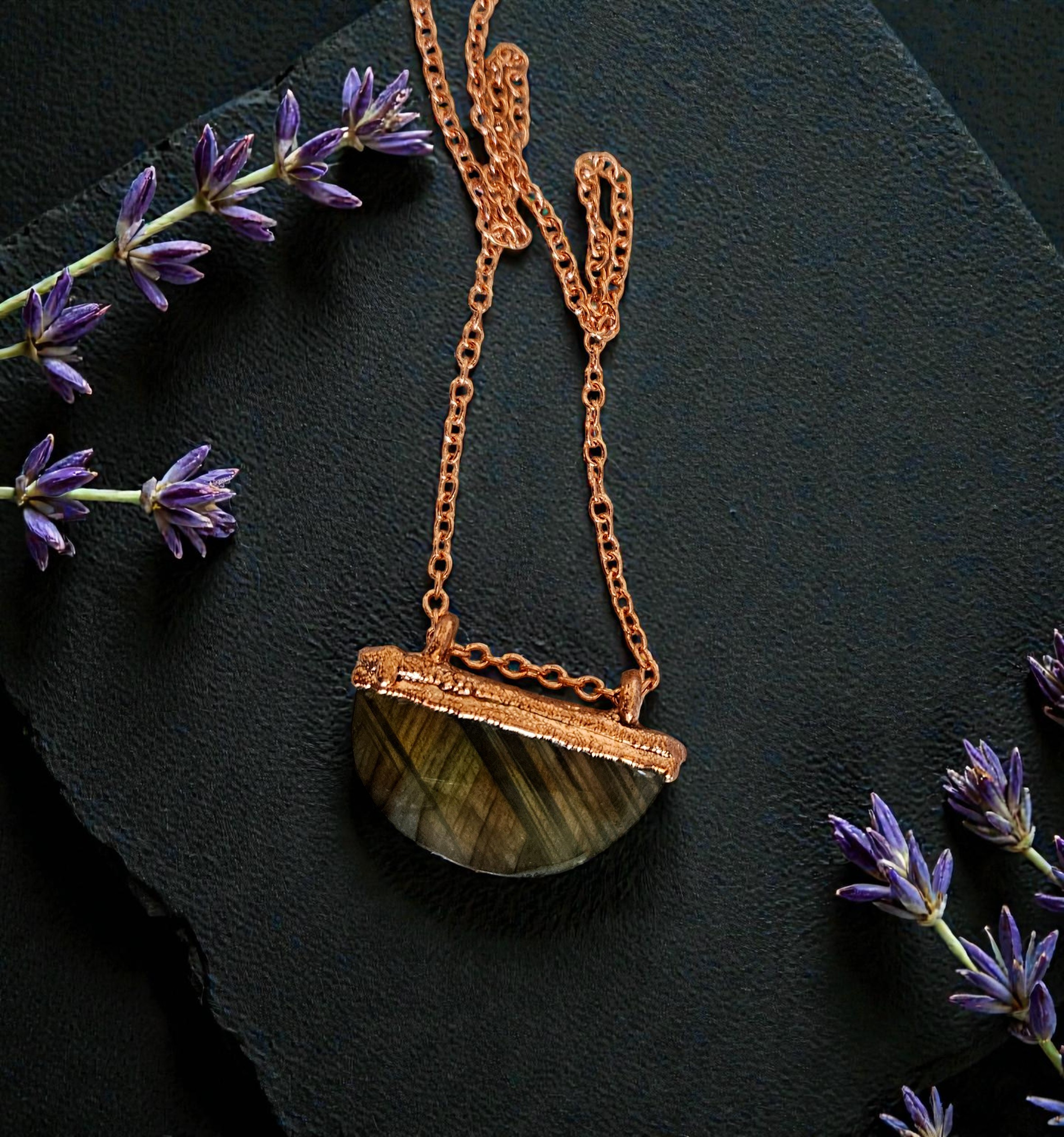 Electroformed Copper: The pendant is encased in a thick, organic layer of electroformed copper, which beautifully complements the flash of the stone.