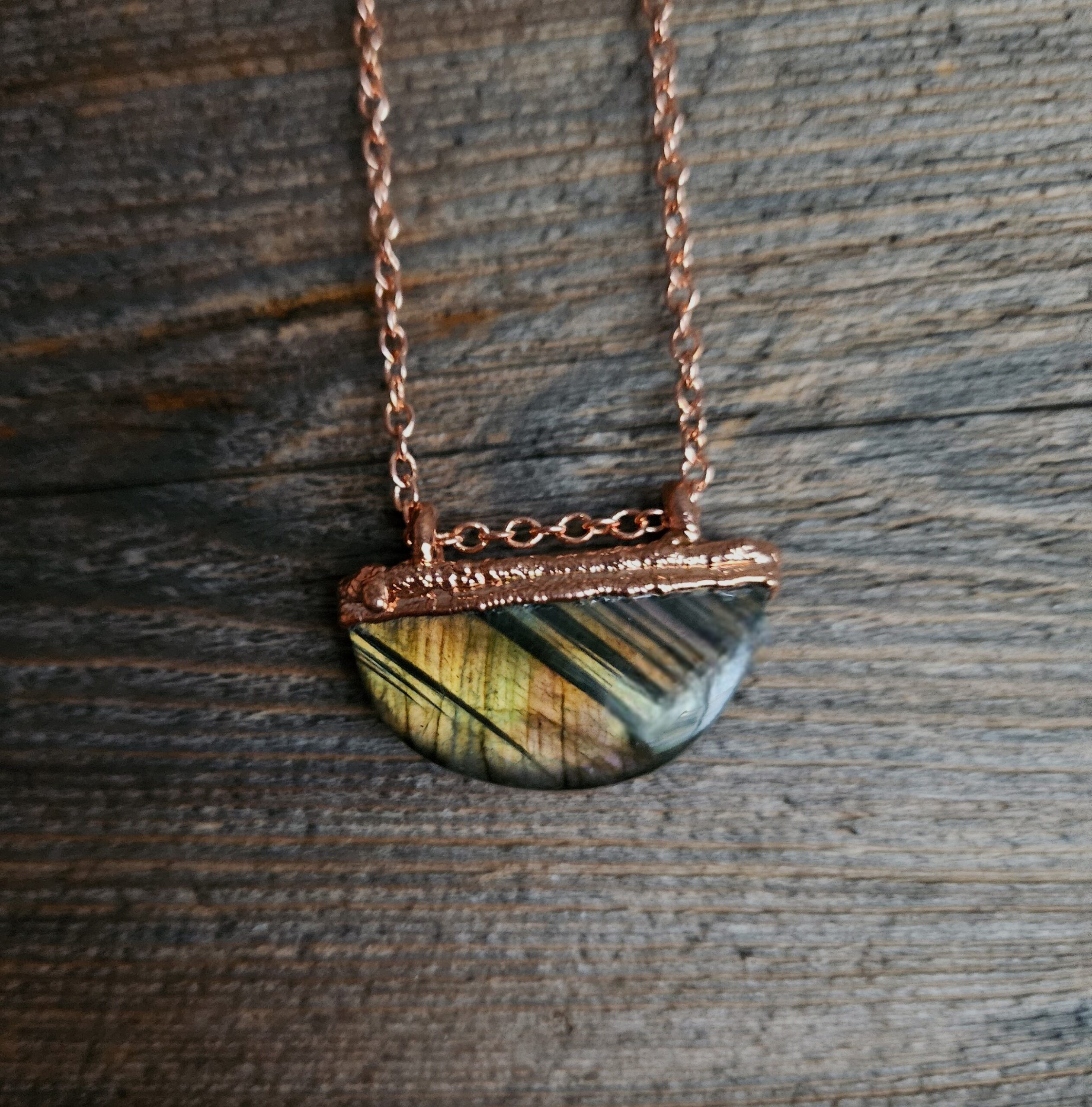 This necklace is a true power piece, handcrafted to serve as a wearable compass for your intuition. Featuring a unique half-moon slab of Labradorite, this pendant is fully electroformed in rich, raw copper. The most magical element? The stone has a brilliant, distinct color flash on both sides, giving you a choice of energy and aesthetics.