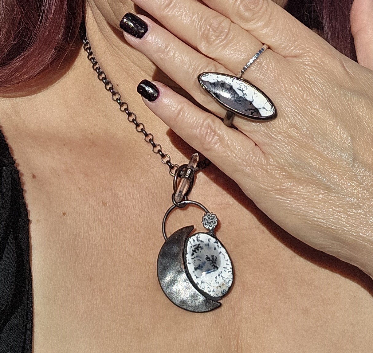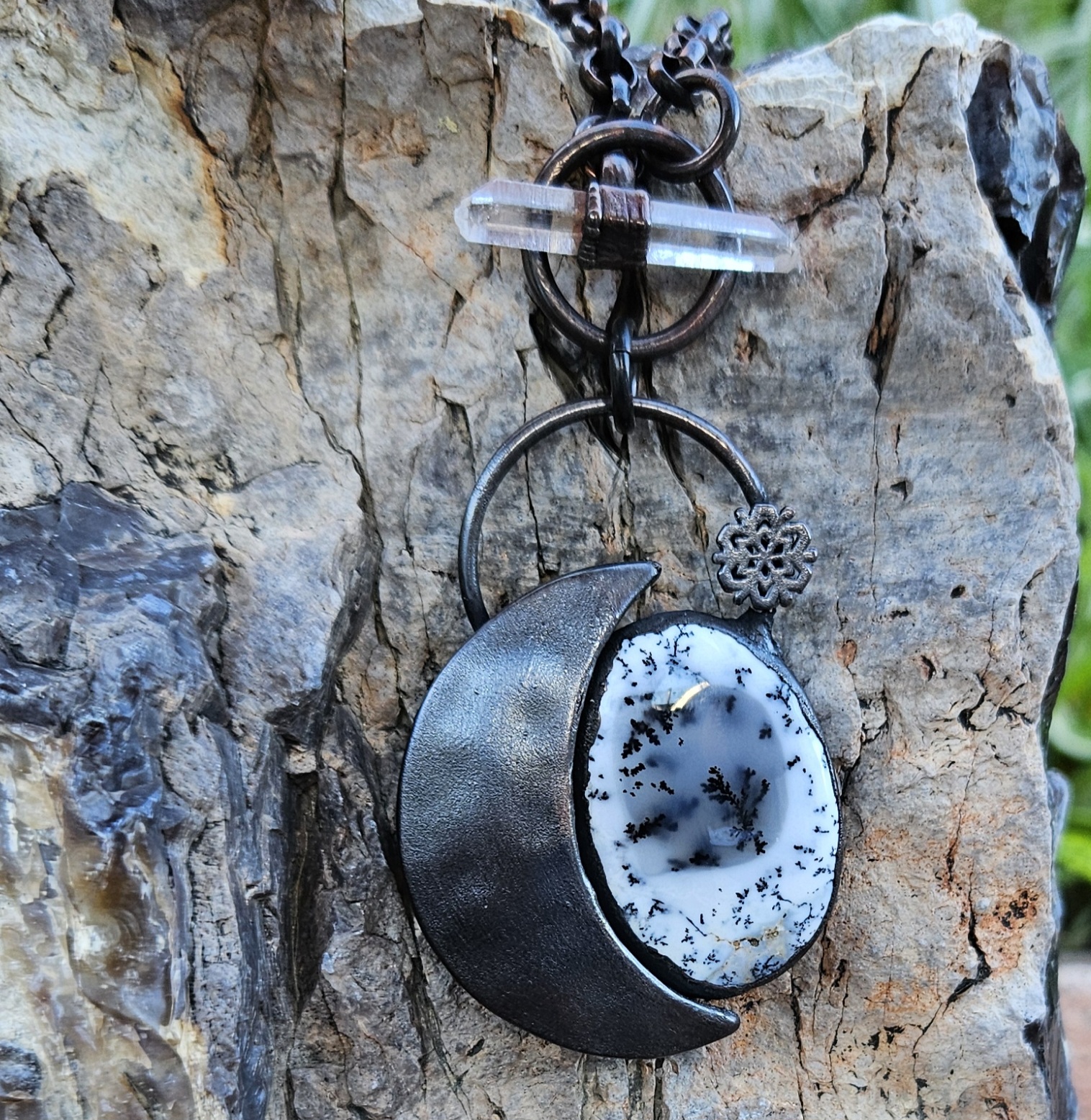 This necklace captures the still, elegant power of mid-winter. The main stone, Dendritic Opal, is a stone of grounding and connection to nature, often called the “stone of inner peace.”