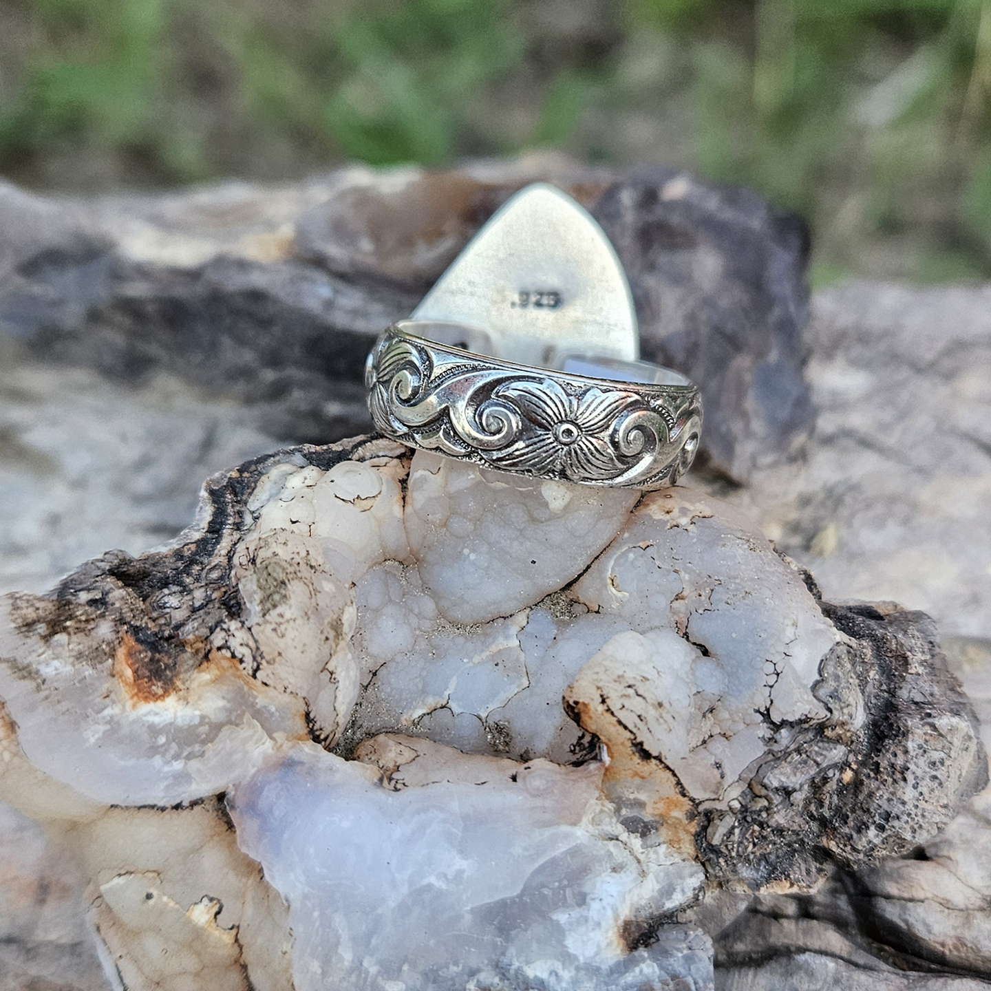 The substantial 6mm wide band features a captivating swirling floral pattern, meticulously crafted in sterling silver. This intricate design enhances the organic beauty of the turquoise, creating a harmonious blend of rugged charm and feminine grace.