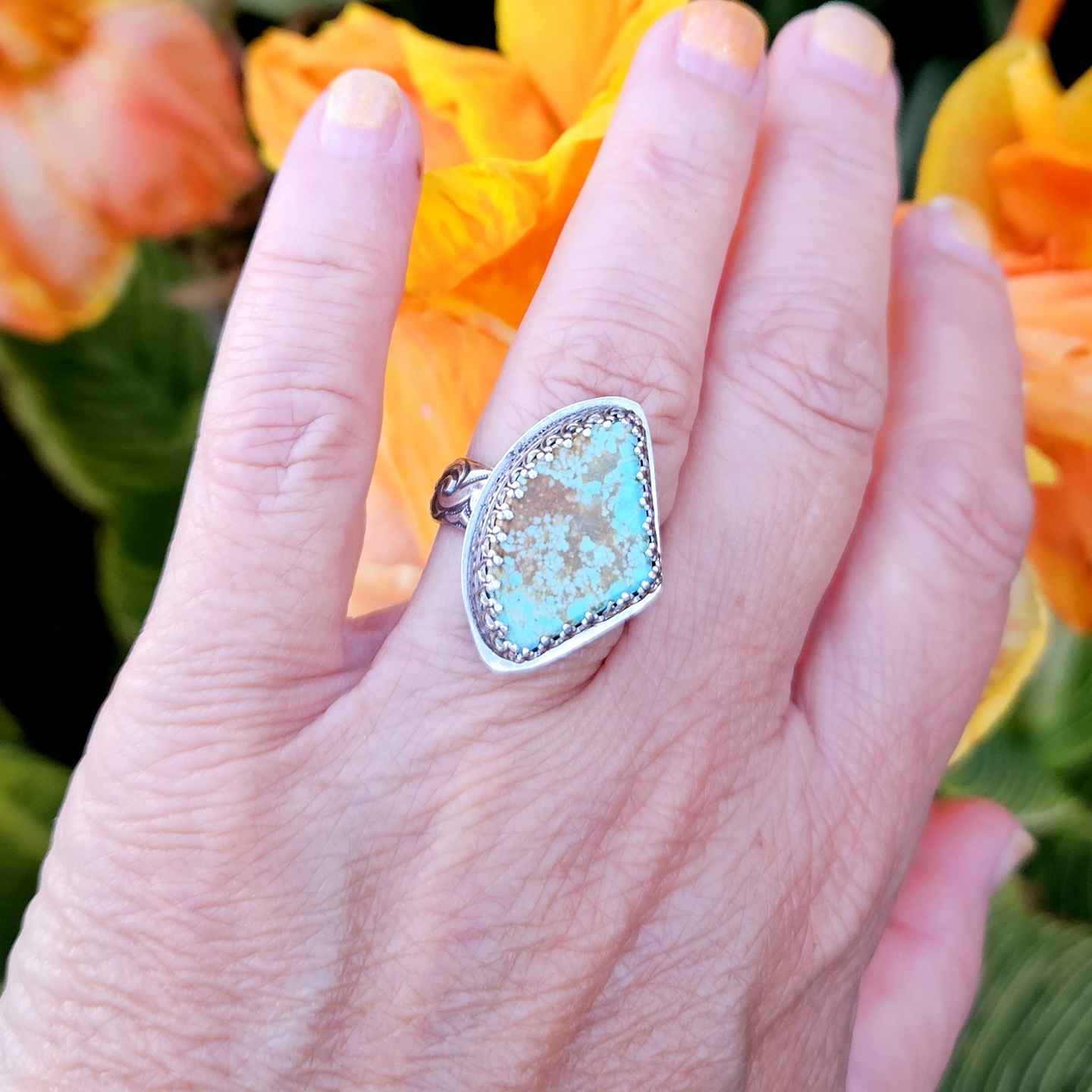 This one-of-a-kind ring showcases a magnificent, fan-shaped Number 8 Mine Turquoise stone, approximately 15.5mm x 23mm. Known for its striking beauty and rarity, genuine Number 8 Mine Turquoise is highly sought after, making this ring a truly special addition to any jewelry collection. The unique stone is meticulously set in a crown-style sterling silver bezel, adding an element of regal elegance to its Boho Western styling.